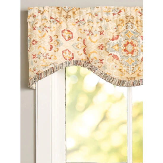 This classic print give your home a regal look with its intricate medallions and geometric patterns. The muted palette and lineny texture coordinate seamlessly with other lineny window treatments. The scalloped valance is finished with fringed trim along the bottom. Valance is sold individually.