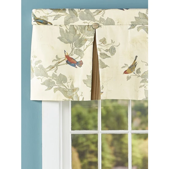 Richly colored songbirds take center stage on this exquisitelylayered valance. The print on top has an unexpectedly satin-like hand. While an underlayer peeks through the bottom hem in corduroy-like, ribbed striped pleats. Lined valance is sold individually.