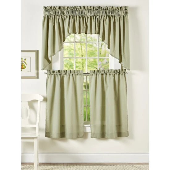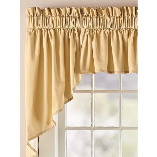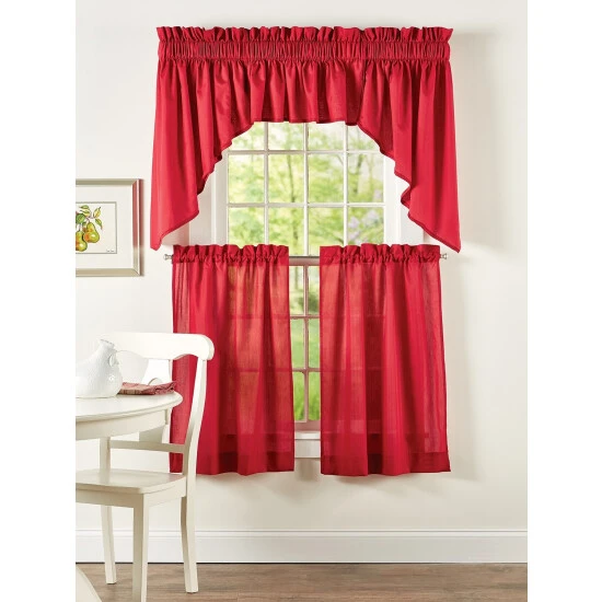 If you love the simple lines of our Jane’s Plain Curtains but would like to add some color to your decor then you’re going to love our Carolyn’s Colorful Collection. They feature the same simple style and quality craftsmanship in a range of colors designedto complement your decor. All styles are made of an easy-care cotton and polyester blend, which means you can just toss them in the washer to keep them looking their best. The lined three-piece set includes two swags and one insert valance.