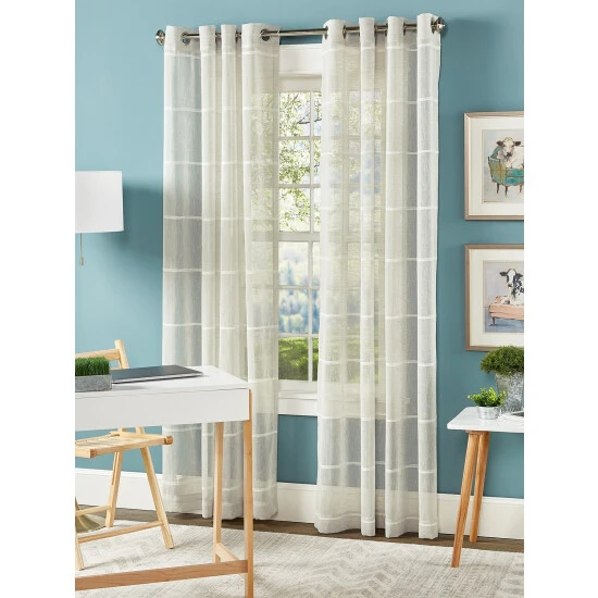 This pretty panel is made of softly draping sheer fabric, which gently filters the light while offering a level of privacy. The panel features chenille stripe accents, spaced out along the length of the panel to add texture and a soft look to your windows. Panel is sold individually.
