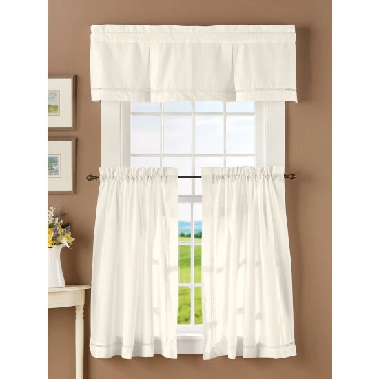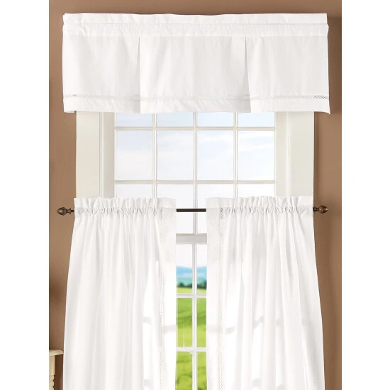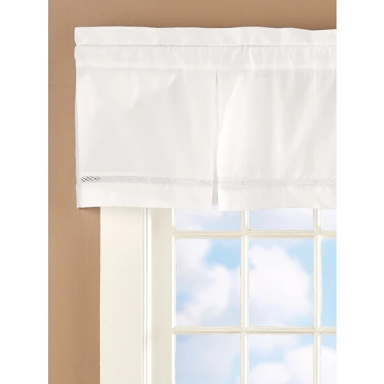 This pretty valance is made of our smooth woven cotton and features a crocheted diamond band accent along the bottom hem. Just that little detail adds timeless charm and appeal and dresses up your windows beautifully. Valance is sold individually.