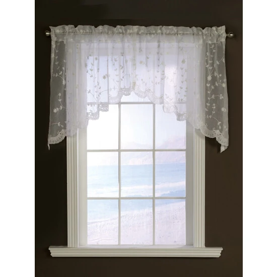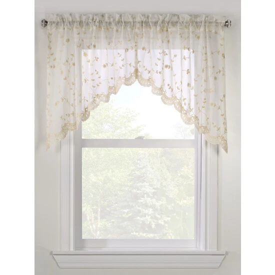 The allover floral embroidery adds charm and beautiful detailing to this swag. Their seemingly weightless drape falls softly down to a scalloped hem while allowing light to beautifully filter through the finely woven fabric. Use alone or pair with matching curtain panels. Swags are sold in pairs.