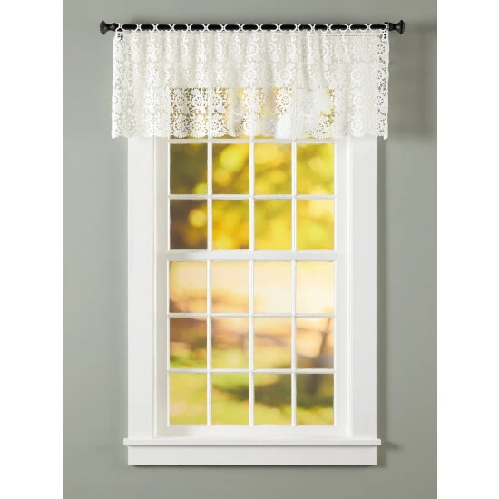 Soft sunlight will shine through the open-weave lace of this airy valance to brighten and beautify your home. Just slip the1-1/2″ round loops through a café curtainrod—and voila, instant beauty! Finished with a scalloped hem.Valance is sold individually.