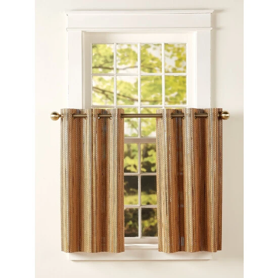 These natural-looking tiers are made from beautifully woven bamboo and feature a grommet top, so each tier easily moves “accordion-style”from side to side. The tight weave helps filter out light, insulates against cold and heat loss, and offers a level of privacy too. The grommets have an antique brass finish; the walnut bamboo panels have a coordinating tonal twill tapeborder. Tiers are sold in pairs.