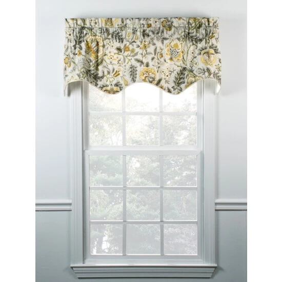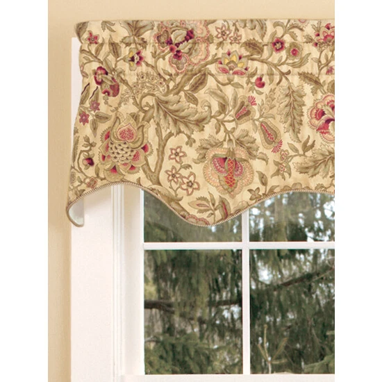 This richly patterned valance features a floral print that’s reminiscent of the tapestries you’d find in English manor homes. Finished with corded trim on the scalloped hem. Lined valance is sold individually.