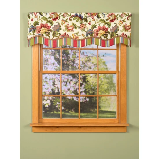 Bold Jacobean florals blossom with elegance across this richly colored scalloped valance. It’s layered with stripes and accented with braided trim for added style and beauty, and it’s lined, so it drapes gracefully. Valance is sold individually.