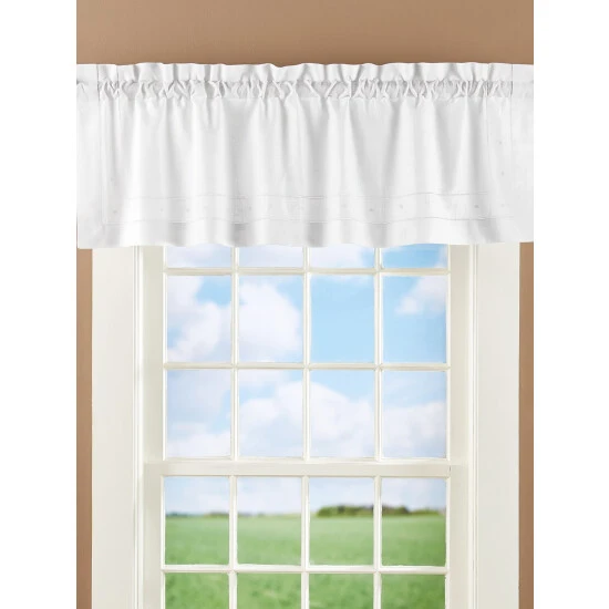 This tailored valance brings more than the richness of linen and an easy drape to your windows. It also adds a touch of elegance as the valance is finished with a hemstitched and embroidered dot border.Valance is sold individually.
