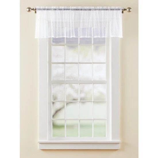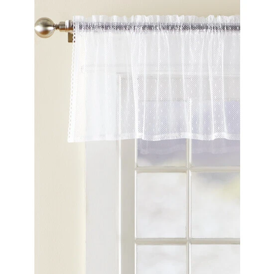 This sheer valance adds a soft touch to your decor in pretty netted lace embroidered with tiny squares. It’s elegant and simple and allows light to filter in gently. Valance is sold individually.
