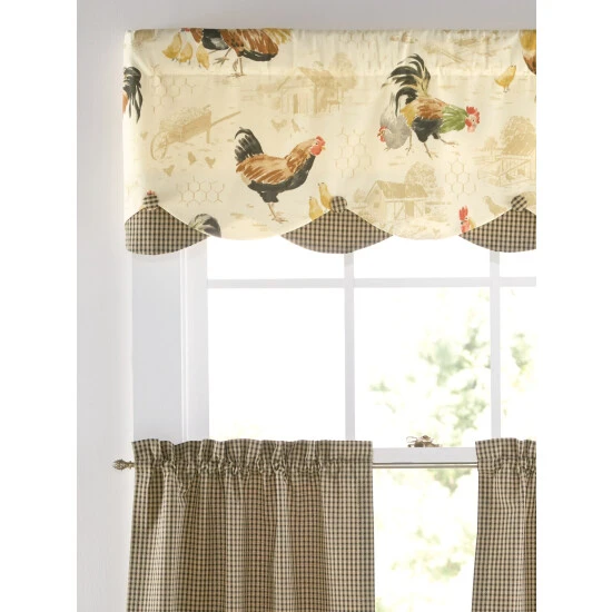 This beautifully lined valance brings two layers of country charm to your home with its handsome rooster print accented with a layer of our Colebrook Check fabric. We like to call it “Farmhouse Toile,” as it reminds us of the fabrics found in French Country homes. Scalloped bottom hem; all around finished hems.