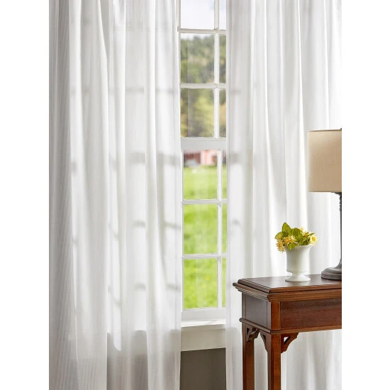 Highlighted by vertical stripes, these semi-sheer curtains add texture and beauty to your windows. They offer a level of privacy while allowing light to filter through. Use them on their own or pair them with solid or patterned panels to create your unique window treatments. Perfect for any room in the house. Curtains are sold in pairs with two matching tiebacks.