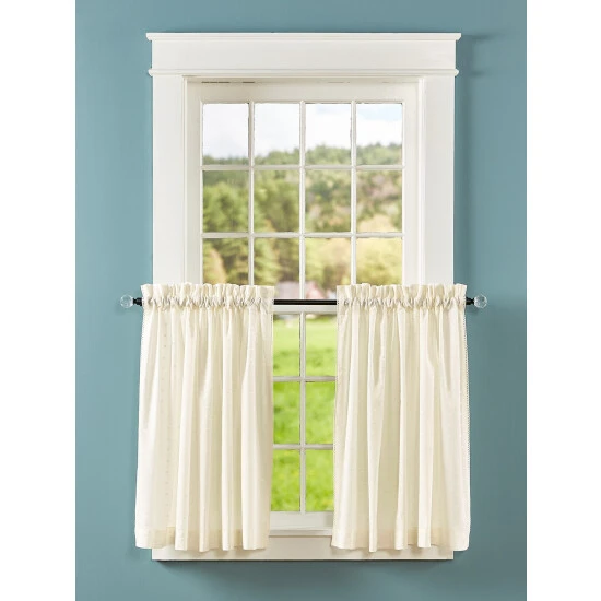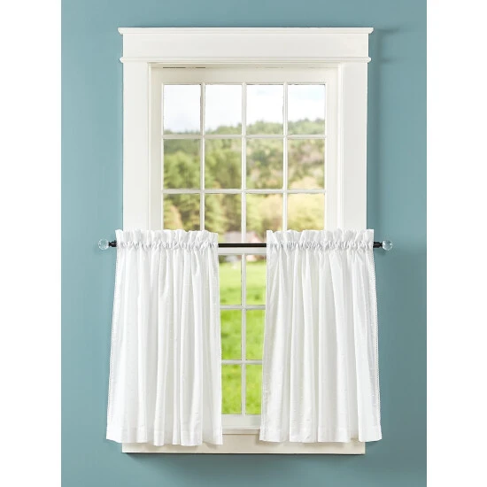 Featherlight voile allows most of the sun’s light to pass through, but not all of itβthe allover swiss-dot embroidery gives this dreamy voile an extra “layer” of enchantment and privacy. Features a beautifully embroidered scalloped trim. Use these tiers on their own or with the matching valance. Tiers are sold in pairs.